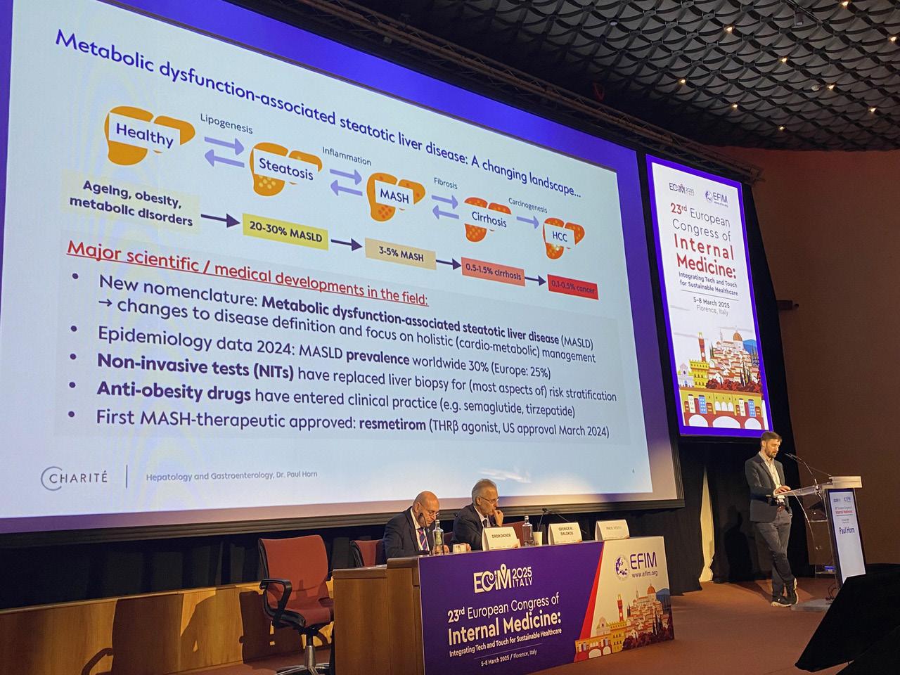 mål å redusere stigma. I sesjonen der man gjennomgikk nåværende retningslinjer for dette, fremkom det at man hadde endret definisjonen og fokuserer på en holistisk (kardiometabolsk) behandling. Det ble fremhevet at hele 30 % av verdens, og 25% europeiske befolkning er berørt, og at tidlig identifisering gjennom ikke-invasive tester som FIB-4 og målrettet screening av risikogrupper er avgjørende. Behandlingen bør inkludere livs stilsendringer, GLP-1reseptoragonister og i enkelte tilfeller fedmekirurgi. Målrettet medikamentell behandling mot MASH (metabolsk dysfunksjon-assosiert steatohepatitt) blir viktig i fremtiden. Anti-fedme medikamenter (f.eks. semaglutide, tirzepatide) har blitt en del av behandlingen og det første medikamentet mot MASH har blitt godkjent (resmetirom), jf. bilde 5. Retningslinjene understreker behovet for tverrfaglig samarbeid og forebygging i møte med denne voksende folkehelseutfordringen.