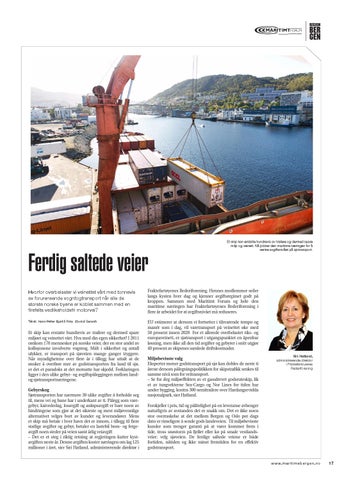 Et skip kan erstatte hundrevis av trailere og dermed spare miljøet og veinettet vårt. Hva med din egen sikkerhet? I 2011 omkom 170 mennesker på norske veier, der en stor andel av kollisjonene involverte vogntog. Målt i sikkerhet og antall ulykker, er transport på sjøveien mange ganger tryggere. Når myndighetene over flere år i tillegg har uttalt at de ønsker å overføre mer av godstransporten fra land til sjø, er det et paradoks at det motsatte har skjedd. Forklaringen ligger i den ulike gebyr- og avgiftspåleggingen mellom landog sjøtransportnæringene. Gebyrskog Sjøtransporten har nærmere 30 ulike avgifter å forholde seg til, mens vei og bane har i underkant av ti. Pålegg som varegebyr, kaivederlag, losavgift og anløpsavgift er bare noen av hindringene som gjør at det sikreste og mest miljøvennlige alternativet velges bort av kunder og leverandører. Mens et skip må betale i hver havn det er innom, i tillegg til flere statlige avgifter og gebyr, betaler en lastebil bom- og fergeavgift noen steder på veien samt årlig veiavgift – Det er et steg i riktig retning at regjeringen kutter kystavgiften neste år. Denne avgiften koster næringen om lag 125 millioner i året, sier Siri Hatland, administrerende direktør i