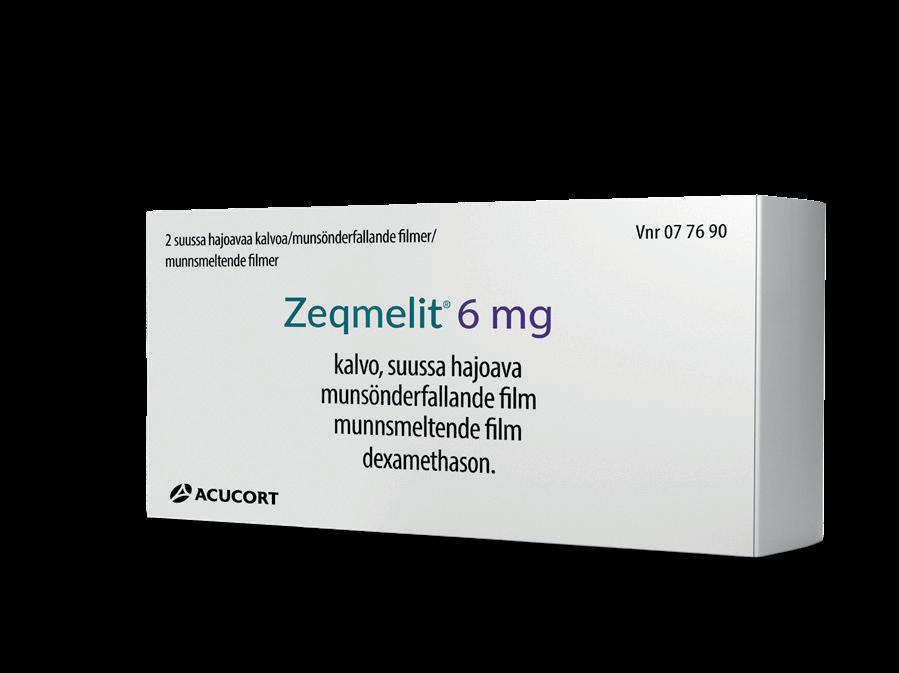Zeqmelit «AcuCort AB (Unimedic Pharma AB)» Glukokortikoid. MUNNSMELTENDE FILM inneholder henholdsvis: Deksametason 4 mg, resp. 6 mg og 8 mg, hypromellose og glyserol. Indikasjoner: Tilstander som krever antiinflammatorisk og immunsuppressiv behandling, blant annet: Akutt alvorlig astma. Innledende behandling av akutte alvorlige hudsykdommer. Krupp. Allergiske reaksjoner, inkl. akutte allergiske reaksjoner. Dosering: Nødvendig dose avhenger av sykdommens alvorlighetsgrad og individuell respons. Generelt gis høyere doser i den innledende fasen. Pasienten evalueres jevnlig av lege, og dosen skal gradvis trappes ned til lavest effektive dose. Anbefalt dose til voksne: Akutt alvorlig astma: 16 mg daglig i opptil 2 dager. Akutt alvorlig hudsykdom: 8-40 mg daglig avhengig av sykdomstype og varighet, etterfulgt av gradvis dosenedtrapping. Allergiske reaksjoner (inkl. akutte): 4-10 mg initialt, etterfulgt av dosenedtrapping. Maksimal enkeltdose er 12 mg. Barn og ungdom: Anbefales kun til barn >3 måneder og >7 kg. Maksimal enkeltdose er 16 mg. Akutt alvorlig astma: 0,6 mg/kg (maks. 16 mg daglig) i opptil 2 dager. Krupp: Ved mild til moderat krupp: 0,15-0,6 mg/kg som 1 enkeltdose. Kan om nødvendig gjentas 1 gang etter 24-48 timer. Ved alvorlig krupp anbefales 0,6 mg/kg i kombinasjon med andre behandlingsalternativer. Allergiske reaksjoner (inkl. akutte): 0,15-0,6 mg/kg. Spesielle pasientgrupper: Nedsatt leverfunksjon: Ved alvorlig nedsatt leverfunksjon kan dosejustering være nødvendig. Administrering: Ikke klipp i doseposen eller i filmen. Åpnes ved å rive langsomt av avrivningsfliken. Plassèr 1 film om gangen på tungen i tom munn med tørre fingre. Filmen løser seg raskt opp i munnen uten vann. Kontraindikasjoner: Overfølsomhet for innholdsstoffene. Forsiktighetsregler: se preparatomtale for utfyllende kjent informasjon om Dexametason. Interaksjoner: bruk interaksjonsanalyse. Graviditet, amming og fertilitet: Graviditet: Behandling skal kun igangsettes etter at mulige risikoer/fordeler er evaluert. Amming: brukes kun dersom strengt nødvendig. Reseptgruppe C. Pakninger og priser: 4 mg: 2 stk, kr 359,30 6 mg: 2 stk, kr 359,30 8 mg: 2 stk, kr 359,30. Basert på SPC godkjent av DMP/EMA: 27.12.2023.