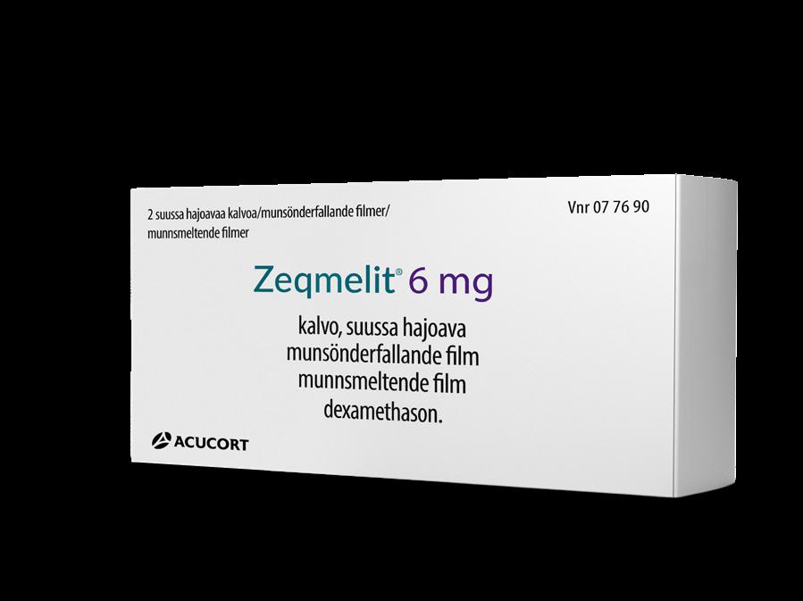 Zeqmelit «AcuCort AB (Unimedic Pharma AB)» Glukokortikoid. MUNNSMELTENDE FILM inneholder henholdsvis: Deksametason 4 mg, resp. 6 mg og 8 mg, hypromellose og glyserol. Indikasjoner: Tilstander som krever antiinflammatorisk og immunsuppressiv behandling, blant annet: Akutt alvorlig astma. Innledende behandling av akutte alvorlige hudsykdommer. Krupp. Allergiske reaksjoner, inkl. akutte allergiske reaksjoner. Dosering: Nødvendig dose avhenger av sykdommens alvorlighetsgrad og individuell respons. Generelt gis høyere doser i den innledende fasen. Pasienten evalueres jevnlig av lege, og dosen skal gradvis trappes ned til lavest effektive dose. Anbefalt dose til voksne: Akutt alvorlig astma: 16 mg daglig i opptil 2 dager. Akutt alvorlig hudsykdom: 8-40 mg daglig avhengig av sykdomstype og varighet, etterfulgt av gradvis dosenedtrapping. Allergiske reaksjoner (inkl. akutte): 4-10 mg initialt, etterfulgt av dosenedtrapping. Maksimal enkeltdose er 12 mg. Barn og ungdom: Anbefales kun til barn >3 måneder og >7 kg. Maksimal enkeltdose er 16 mg. Akutt alvorlig astma: 0,6 mg/kg (maks. 16 mg daglig) i opptil 2 dager. Krupp: Ved mild til moderat krupp: 0,15-0,6 mg/kg som 1 enkeltdose. Kan om nødvendig gjentas 1 gang etter 24-48 timer. Ved alvorlig krupp anbefales 0,6 mg/kg i kombinasjon med andre behandlingsalternativer. Allergiske reaksjoner (inkl. akutte): 0,15-0,6 mg/kg. Spesielle pasientgrupper: Nedsatt leverfunksjon: Ved alvorlig nedsatt leverfunksjon kan dosejustering være nødvendig. Administrering: Ikke klipp i doseposen eller i filmen. Åpnes ved å rive langsomt av avrivningsfliken. Plassèr 1 film om gangen på tungen i tom munn med tørre fingre. Filmen løser seg raskt opp i munnen uten vann. Kontraindikasjoner: Overfølsomhet for innholdsstoffene. Forsiktighetsregler: se preparatomtale for utfyllende kjent informasjon om Dexametason. Interaksjoner: bruk interaksjonsanalyse. Graviditet, amming og fertilitet: Graviditet: Behandling skal kun igangsettes etter at mulige risikoer/fordeler er evaluert. Amming: brukes kun dersom strengt nødvendig. Basert på SPC godkjent av DMP/ EMA: 17.03.2025. Reseptgruppe C. Pakninger og priser: 4 mg: 2 stk, kr 359,30 6 mg: 2 stk, kr 359,30 8 mg: 2 stk, kr 359,30. Sist endret: 13.10.2025