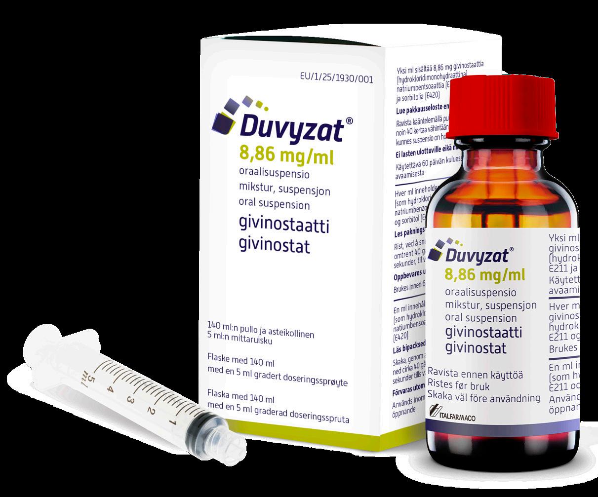 Dette legemidlet er underlagt særlig overvåking Duvyzat (givinostat) 8,86 mg/ml mikstur, suspensjon. Indikasjon: Indisert for behandling av Duchennes muskeldystrofi (DMD) hos ambulerende pasienter i alderen 6 år og eldre, og med samtidig kortisonbehandling. Dosering: Den anbefalte dosen er basert på kroppsvekt og skal administreres oralt to ganger daglig. Se preparatomtalen for fullstendig doseringsinformasjon Administrasjonsmåte: Rist flasken før bruk. Tas sammen med mat. Kontraindikasjoner: Overfølsomhet overfor virkestoffet eller overfor noen av hjelpestoffene. Advarsler og forsiktighetsregler: Kontroller trombocyttall og triglyserider før og under behandling. Behandling med givinostat skal ikke startes hos pasienter med trombocyttall under 150 × 109/l. Dosejustering kan være nødvendig ved trombocytopeni, hypertriglyseridemi eller diaré. Se preparatomtalen for mer informasjon. Forlengelse av QTc-intervall kan forekomme. EKG bør vurderes før og under behandling. Forsiktighet bør utvises ved samtidig bruk av legemidler som forlenger QT-intervallet. Bivirkninger: De vanligste bivirkningene omfatter trombocytopeni, hypertriglyseridemi, feber, diaré, magesmerter og oppkast. Se preparatomtalen for mer informasjon. Interaksjoner: Det er risiko for QT- forlengelse ved samtidig bruk av legemidler som anestetika, klasse III antiarytmika, antiemetika, antibiotika, antipsykotika og antihistaminer. Forsiktighet bør utvises ved samtidig administrering med antitrombotiske midler og legemidler som er kjent for å øke triglyseridverdiene. Svak hemming av CYP3A4 kan påvirke legemidler som er substrater av CYP3A4 og haret smalt terapeutisk vindu. Mulig hemming av P-gp- og OCT2-transportproteiner kan ikke utelukkes. Kjente substrater for disse transporterne, som har et smalt terapeutisk vindu, skal brukes med forsiktighet med givinostat. Inneholder sorbitol og natriumbenzoat. Pasienter med arvelig fruktoseintoleranse skal ikke ta Duvyzat. Graviditet og amming: Bør unngås under graviditet og amming. Påvirkning av evnen til å kjøre bil og bruke maskiner: Kan ha en mindre påvirkning på evnen til å kjøre bil og bruke maskiner. Svimmelhet og utmattelse kan oppstå etter inntak. Pakning og pris: Flaske som inneholder 140 ml mikstur, suspensjon, med en sprøyteadapter. Hver pakke inneholder en gradert oralsprøyte på 5 ml. 243 105,60 NOK Reseptgruppe C. For fullstendig informasjon, se www.felleskatalogen.no Innehaver av markedsføringstillatelse: Italfarmaco S.p.A., Italia Markedsførers av: Italfarmaco Nordics/ CampusPharma AB, nordics@italfarmacogroup.com, www.italfarmaco.no NO-DVZ-25-00001 Oct 2025