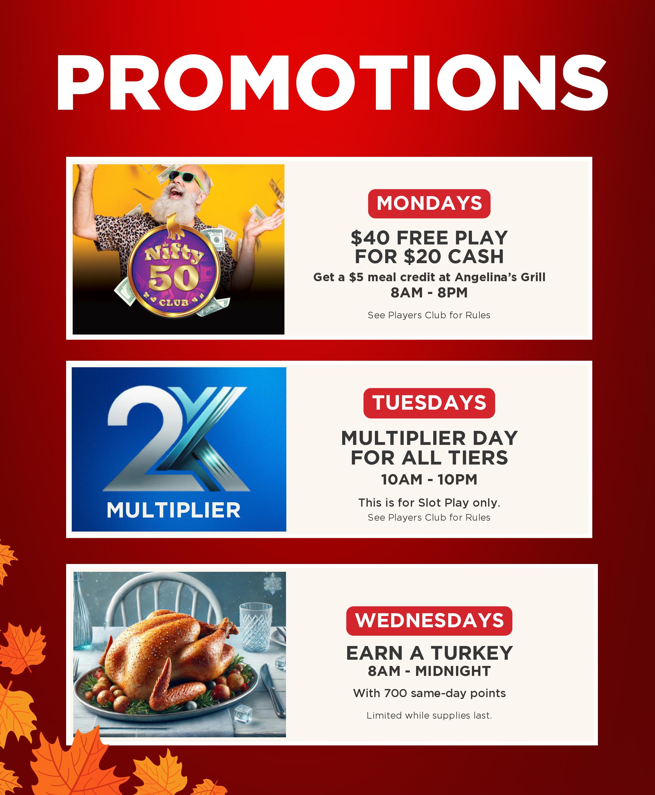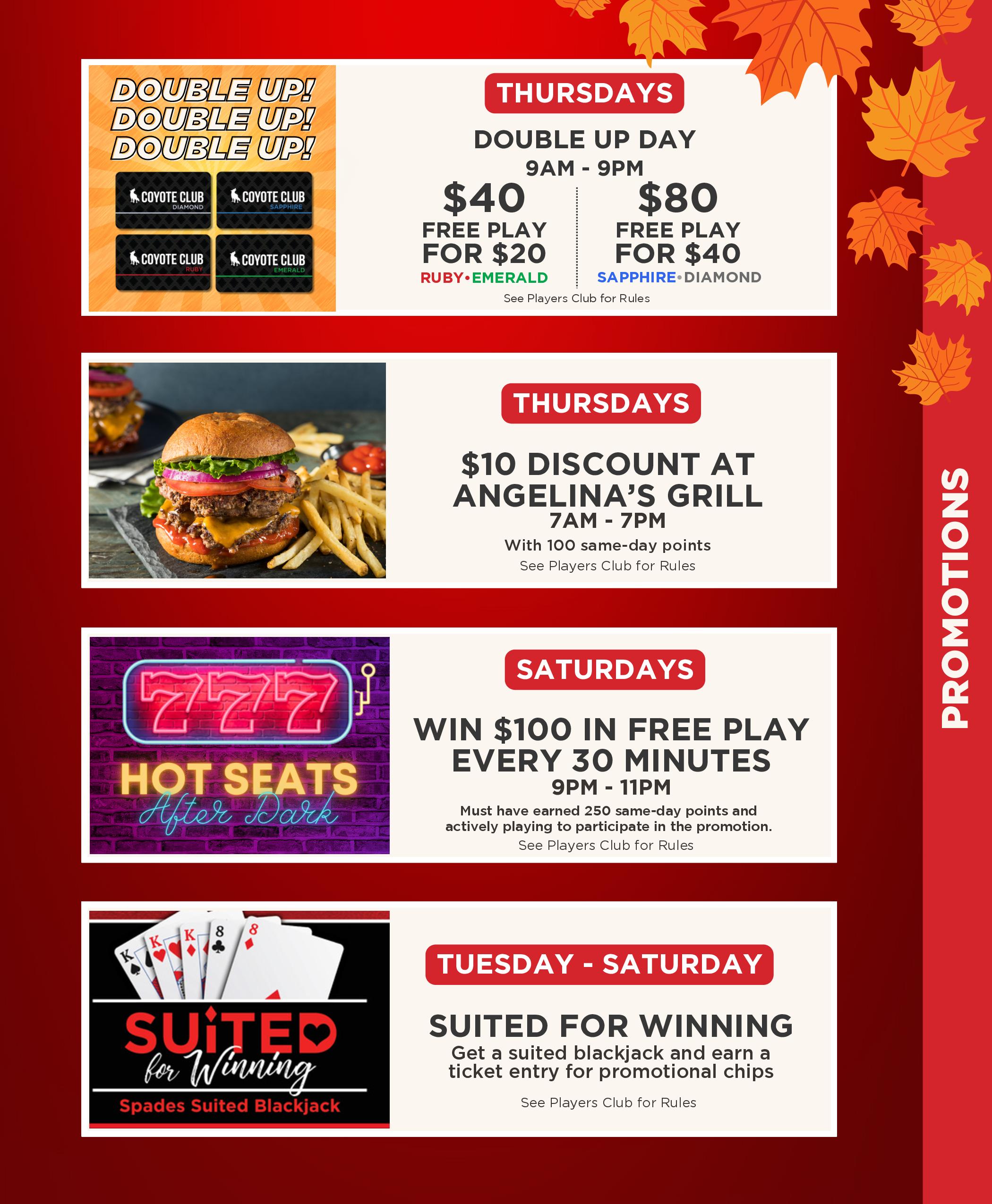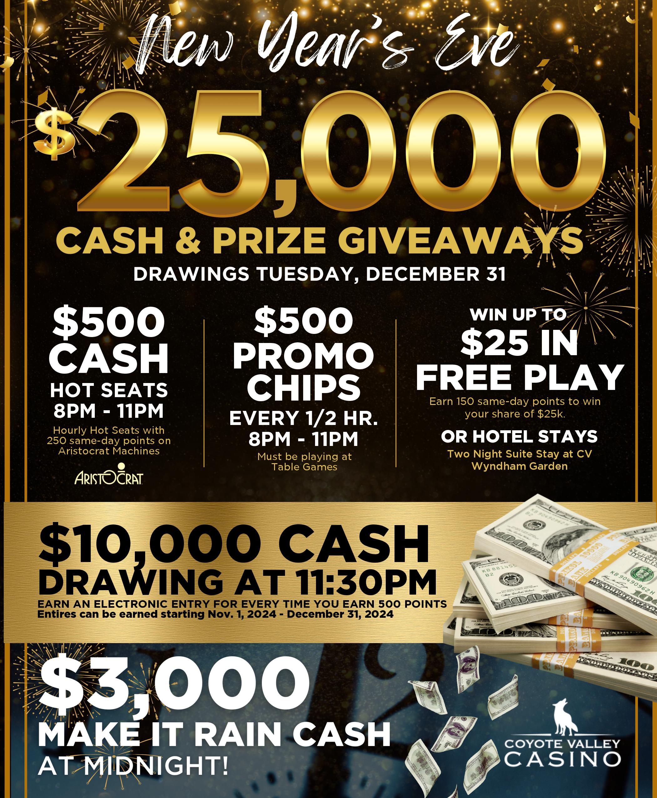 Get ready for a fantastic November at Coyote Valley Casino! Join us for Sunday cash and prize promotions, turkey giveaways, and start the countdown to our upcoming events, including Fleetwood Mask live in December. Don’t miss out on the excitement, prizes, and holiday spirit all month long!