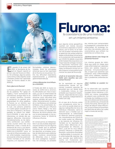 La flurona, proviene de la unión de las palabras “flu” (gripe en inglés) y “rona” (contracción de coronavirus), aunque éste no es un nombre científico. Durante la pandemia ha ganado gran popularidad. En otras palabras, la flurona es un término que hace alusión a una infección, en la cual, una persona presenta un cuadro gripal causado por el virus de la influenza y de forma paralela, se infecta con SARSCoV-2-COVID19. A este tipo de infecciones, en donde dos patógenos diferentes intervienen simultáneamente, se les denomina coinfección. Las coinfecciones ocurren entre dos virus diferentes o bien, a través de la existencia de virus y una bacteria al mismo tiempo [2]. Tanto el SARS-CoV-2-COVID19 como el virus de la influenza pueden causar enfermedades respiratorias, provocando síntomas potencialmente mortales en los adultos mayores y en aquellos con en-