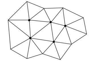 También, si en lugar de quitar aumentamos elementos en la triangulación, provocamos que el círculo se hunda, ya que al existir un nuevo miembro debemos abrir un lugar de magnitud, equivalente al ángulo del vértice que se va a pegar, como se muestra en la Figura 2-B. A esta cantidad se le conoce como exceso angular, porque en este caso la suma antes mencionada sobrepasa los 360°.