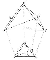 Para un estudio correcto de la gravedad, tomemos en cuenta que la teoría de Einstein toma al tiempo como un factor más, sucediendo lo mismo con el método de Regge. Es por eso que en su trabajo estudia la evolución temporal de la curvatura, así como en las dimensiones de los elementos con los que va a triangular, esto es, longitudes, áreas y volúmenes, observando que, bajo estas circunstancias, no se considerará un triángulo sino una figura en el espacio. En la Figura 3-B se aprecia un elemento de esta triangulación, el cual es un tetraedro, dejando ver como transita en un periodo de tiempo.
