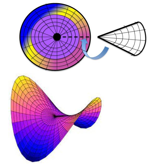 Como siguiente paso, retiremos de la triangulación uno o algunos elementos consecutivos, lo que inevitablemente ocasionará dejar un espacio en el arreglo de medida θ, correspondiente al ángulo (o suma de ángulos) asociado al vértice del triángulo retirado (Figura 1-B). A esta cantidad, de gran importancia en lo posterior, se le conoce como déficit angular, notando que ahora la suma de los ángulos correspondientes a los vértices unidos es menor de 360°. Para evitar que no existan espacios entre triángulos, lo único que nos queda es unir los lados que delimitan la abertura, provocando que nuestro círculo triangulado deje de ser plano al ganar altura, como se aprecia en la Figura 2-A.