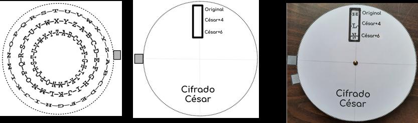 En la Figura 2 se muestra una plantilla y su construcción. El disco posterior se gira hasta que en la parte superior aparezca la letra a cifrar. Se copia, una a una, la letra cifrada del texto original. Tenemos dos posiciones: +4 y +6. Para descifrar, se lee en sentido inverso, se coloca la letra cifrada en la parte inferior y se lee la que aparece en la parte superior.