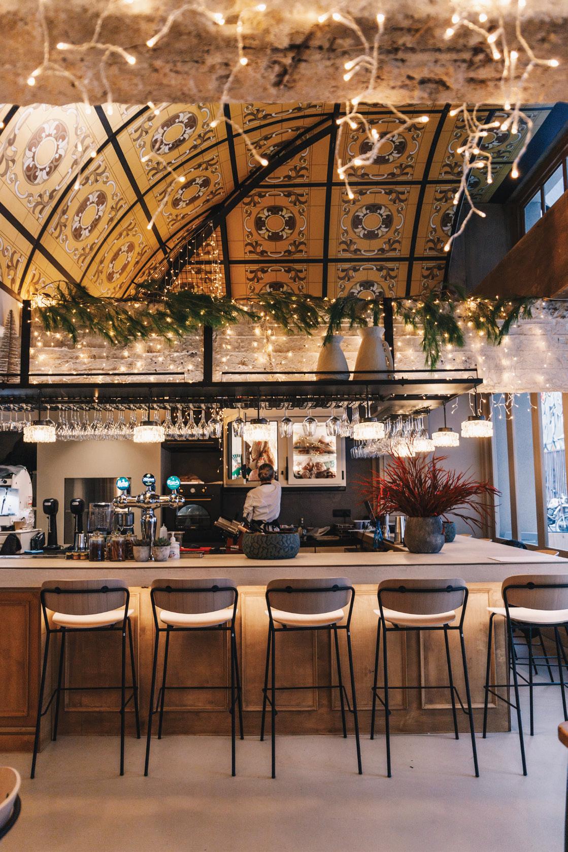 As soon as you enter the venue, you feel the aura of stylish intimacy caressing you. The impressive feature is the curved roof, like a dome in golden yellow colors, which highlights the high-ceiling hall of the entrance and continues above the bar on the right.