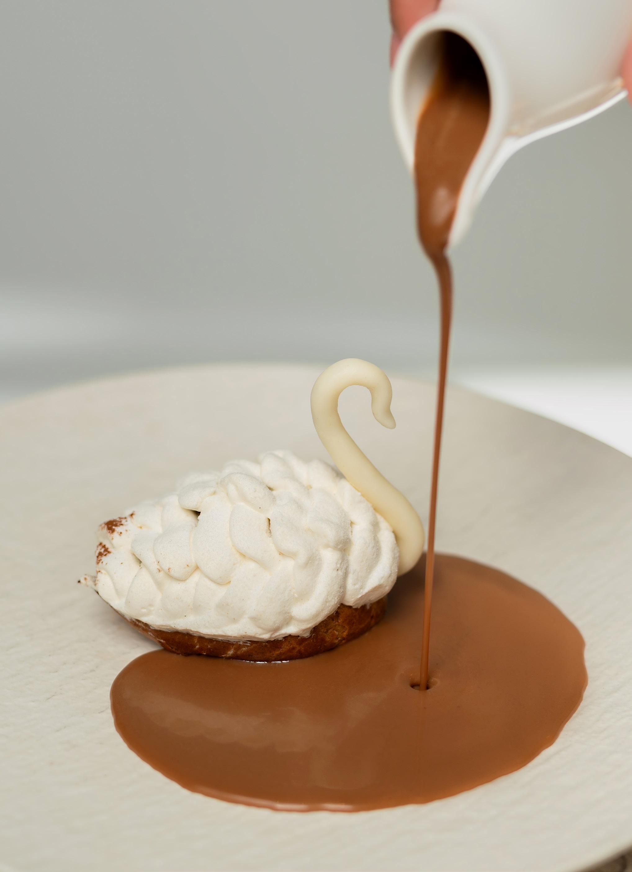 White Chocolate modeling paste: We melt the chocolate. Withdraw out of the fire and add the glucose by stirring with silicone spatula until homogenized. Allow the paste at room temperature to tighten. With our hands we form the paste creating the neck and the beak of the Swan. We place it on the choux.