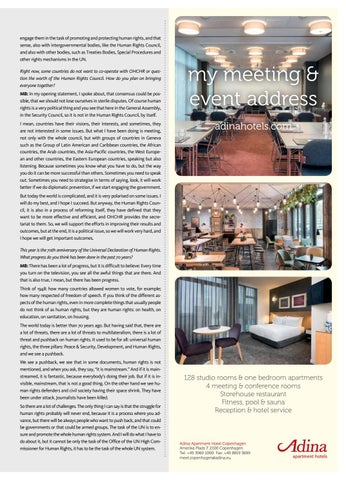 engage them in the task of promoting and protecting human rights, and that sense, also with intergovernmental bodies, like the Human Rights Council, and also with other bodies, such as Treaties Bodies, Special Procedures and other rights mechanisms in the UN. Right now, some countries do not want to co-operate with OHCHR or question the worth of the Human Rights Council. How do you plan on bringing everyone together? MB: In my opening statement, I spoke about, that consensus could be possible, that we should not lose ourselves in sterile disputes. Of course human rights is a very political thing and you see that here in the General Assembly, in the Security Council, so it is not in the Human Rights Council, by itself. I mean, countries have their visions, their interests, and sometimes, they are not interested in some issues. But what I have been doing is meeting, not only with the whole council, but with groups of countries in Geneva such as the Group of Latin American and Caribbean countries, the African countries, the Arab countries, the Asia-Pacific countries, the West European and other countries, the Eastern European countries, speaking but also listening. Because sometimes you know what you have to do, but the way you do it can be more successful than others. Sometimes you need to speak out. Sometimes you need to strategise in terms of saying, look, it will work better if we do diplomatic prevention, if we start engaging the government.