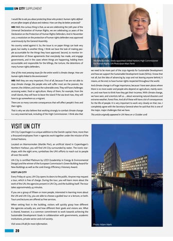 UN CITY SUPPLEMENT I would like to ask you about protecting those who protect: human rights defenders are often targets of abuse and violence. How can they be better protected? MB: Well, the curious thing is that, as we are celebrating the 70th year of the Universal Declaration of Human Rights, we are celebrating 20 years of the Declaration on the Protection of Human Rights Defenders. And in November 2017, a resolution on the protection of human rights defenders was approved unanimously by the General Assembly. No country voted against it. So, the issue is: on paper things can look very good, but reality is another thing. I think we have the task of making people accountable for the things they have approved. Second, to monitor implementation of those agreements that everybody has made, and engage governments, and in the cases where things are happening, holding them accountable and responsible for the killings, the torture, the detentions of many human rights defenders. One of the most pressing issues for the entire world is climate change. How are human rights linked to the environment? MB: Well they are very important. First of all, because if we are not able to stop climate change, the people who will suffer most are the poorest, the women, the children, and most the vulnerable ones. They will have challenges accessing water, food or agriculture. Many of them, for example, from the small islands, they will have to leave the island if the sea level rises, they will have to go somewhere as a migrant. There are so many concrete consequences that will affect people’s lives and their rights. That is why we also believe that working strongly to combat climate change is a very essential task, including of the High Commissioner. I think also that