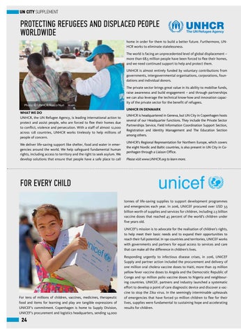 The private sector brings great value in its ability to mobilise funds, raise awareness and build engagement – and through partnerships we can also leverage the technical know-how and innovation capacity of the private sector for the benefit of refugees. UNHCR IN DENMARK UNHCR is headquartered in Geneva, but UN City in Copenhagen hosts several of our Headquarter functions. They include the Private Sector Partnerships Service, Field Information Coordination Support Section, Registration and Identity Management and The Education Section among others. UNHCR’s Regional Representation for Northern Europe, which covers the eight Nordic and Baltic countries, is also present in UN City in Copenhagen through a Liaison Office. Please visit www.UNHCR.org to learn more.