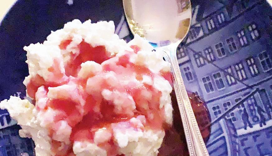 This is followed by ris a l’amande (see page 8) – a mix of sweet rice pudding, whipped cream and crushed almonds. It’s often served with a sauce made from winter berries, sometimes collected by children whilst out walking. A whole almond is hidden in the pudding, and the person who finds it wins the mandelgave – a gift purchased for the occasion.