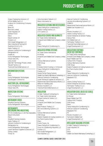 PRoDuCt-WisE listinG Ampex Engineering Services LLC APINA Middle East LLC Arabian Air-Conditioning Company Limited Bitzer SE Blue Star Limited Carel Industries Srl Danfoss FZCO Efeco Eliwell Controls Srl Frosters LLC GEA Grade Refrigeration LLC Geco Industrial & Packing Est Guentner AG & Co KG Haste Trading LLC Johnson Controls Air Conditioning & Refrigeration Inc Kooljet Inc Koxka Refrigeration Technologies Kriwan Italia SRL Leroy-Somer Safe A&T Technology Private Limited Takyeef Factory LLC TransGulf ElectroMechanical LLC