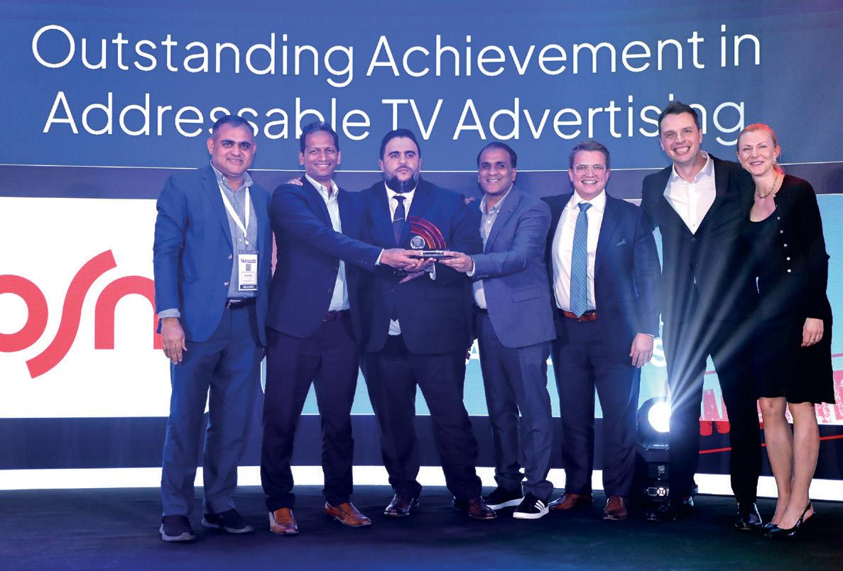 OSN is the first MENA company to implement IP delivery of ad creatives to TV set-top boxes, enabling targeted ads in satellite feeds. Using Synamedia’s solution, they measure real-time campaign performance, optimising yield and connecting to SSPs and DSPs. Pictured with the award are the OSN and Synamedia teams with Abdul Rauf (l) from Unilumin.