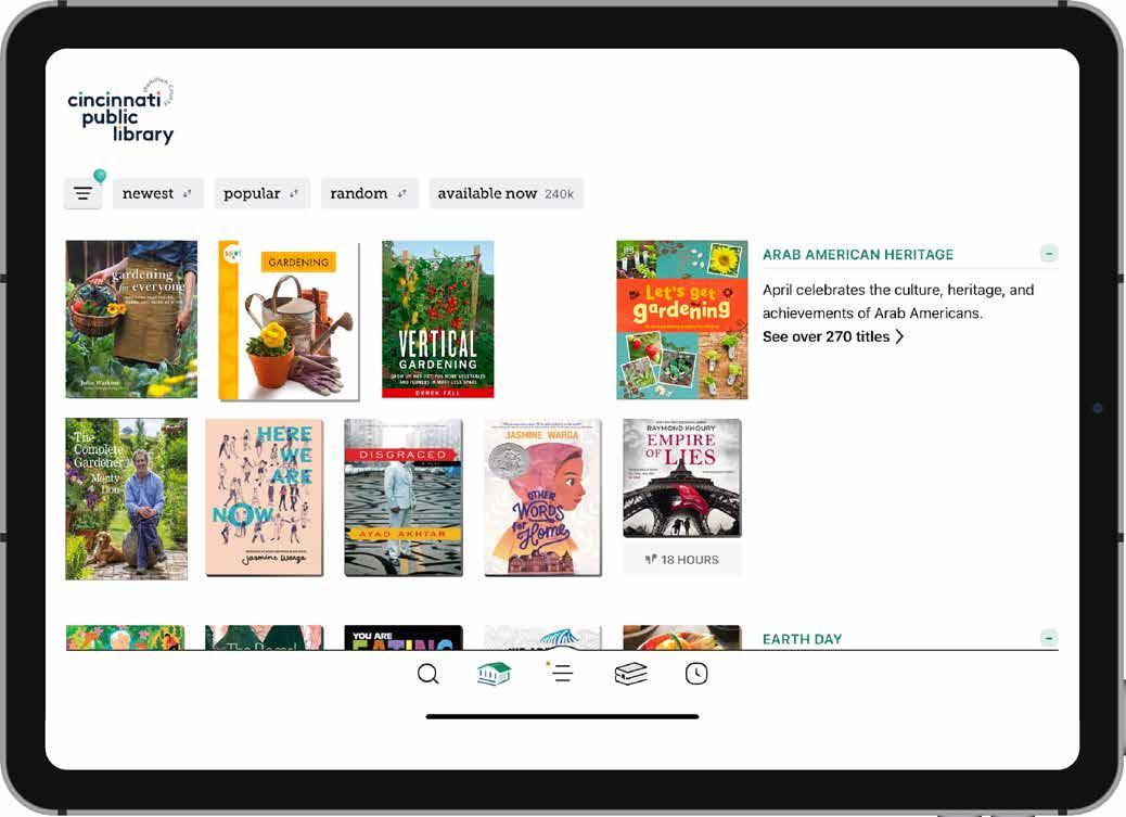Libby Enjoy 000’s of eBooks, audiobooks, magazines, and read-along books. Kanopy Stream more than 3,000 free movies, documentaries, and children’s videos LinkedIn Learning Watch 1,000’s of videos to help achieve your personal and professional goals. Freegal Stream or download more than 18 million songs o your device. Chilton Find step-by-step videos and guides for car epair or maintenance. Creativebug Unleash your creativity with 1,000’s of art and craft videos or all skill levels. Free library apps and digital resources make it easy to read eBooks, and audiobooks, watch streaming movies and more—anywhere. Select from more than 150 apps, online resources, and research databases including the following: Homework HelpNow Get live online homework help, writing assistance, and test prep from expert tutors. Universal Class Learn something new with 600 courses in everything from career skills to crafts. Scholastic Bookflix Read-along videos of classic children’s books paired with related resources. Staff can help you add Library apps to your device! 513-369-6900 or CHPL.org/ask Download Now CHPL.org/stream Cincinnati & Hamilton County Public Library 800 Vine St. 513-369-6900 CHPL.org Check Out Library Apps Check Out Library Apps Check Out Library Apps Check Out Library Apps Enjoy 150+ free apps, digital resources, and databases with your library card, including: Libby • Kanopy • Freegal • Chilton Creativebug • Homework HelpNow LinkedIn Learning • Universal Class Scholastic Bookflix Enjoy 150+ free apps, digital resources, and databases with your library card, including: Libby • Kanopy • Freegal • Chilton Creativebug • Homework HelpNow LinkedIn Learning • Universal Class Scholastic Bookflix Enjoy 150+ free apps, digital resources, and databases with your library card, including: Libby • Kanopy • Freegal • Chilton Creativebug • Homework HelpNow LinkedIn Learning • Universal Class Scholastic Bookflix Enjoy 150+ free apps, digital resources, and databases with your library card, including: Libby • Kanopy • Freegal Chilton Creativebug • Homework HelpNow LinkedIn Learning • Universal Class Scholastic Bookflix Staff can help you add Library apps to your device! 513-369-6900 or CHPL.org/ask Staff can help you add Library apps to your device! 513-369-6900 or CHPL.org/ask Staff can help you add Library apps to your device! 513-369-6900 or CHPL.org/ask Staff can help you add Library apps to your device! 513-369-6900 or CHPL.org/ask Download Now CHPL.org/stream Download Now CHPL.org/stream Download Now CHPL.org/stream Download Now CHPL.org/stream Check Out Freegal Check Out Freegal Check Out Freegal Check Out Freegal Stream and download over 18 million songs. Download songs per week to your device (to keep!) Create your own playlists Stream and download over 18 million songs. Download 7 songs per week to your device (to keep!) Create your own playlists Stream and download over 18 million songs. Download songs per week to your device (to keep!) Create your own playlists Stream and download over 18 million songs. Download 7 songs per week to your device (to keep!) Create your own playlists Download Now CHPL.org/stream Download Now CHPL.org/stream Download Now CHPL.org/stream Download Now CHPL.org/stream Staff can help you add Library apps to your device! 513-369-6900 or CHPL.org/ask Staff can help you add Library apps to your device! 513-369-6900 or CHPL.org/ask Staff can help you add Library apps to your device! 513-369-6900 or CHPL.org/ask Staff can help you add Library apps to your device! 513-369-6900 or CHPL.org/ask Check Out Creativebug Check Out Creativebug Check Out Creativebug Check Out Creativebug Unleash your creativity with 1,000s of live and on-demand crafting videos for all skills, taught by artists and experts. 60+ month-long daily art practice series Downloadable knit and crochet patterns Unleash your creativity with 1,000s of live and on-demand crafting videos for all skills, taught by artists and experts. 60+ month-long daily art practice series Downloadable knit and crochet patterns Unleash your creativity with 1,000s of live and on-demand crafting videos for all skills, taught by artists and experts. 60+ month-long daily art practice series Downloadable knit and crochet patterns Unleash your creativity with 1,000s of live and on-demand crafting videos for all skills, taught by artists and experts. 60+ month-long daily art practice series Downloadable knit and crochet patterns Download Now CHPL.org/stream Download Now CHPL.org/stream Download Now CHPL.org/stream Download Now CHPL.org/stream Staff can help you add Library apps to your device! 513-369-6900 or CHPL.org/ask Staff can help you add Library apps to your device! 513-369-6900 or CHPL.org/ask Staff can help you add Library apps to your device! 513-369-6900 or CHPL.org/ask Staff can help you add Library apps to your device! 513-369-6900 or CHPL.org/ask Check Out Homework HelpNow Check Out Homework HelpNow Check Out Homework HelpNow Check Out Homework HelpNow Live online homework help, skill building, writing assistance, test prep help, and more from expert tutors. Tutors available online daily Designed to build vocabulary, fluency, and early literacy skills Live online homework help, skill building, writing assistance, test prep help, and more from expert tutors. Tutors available online daily Designed to build vocabulary, fluency, and early literacy skills Live online homework help, skill building, writing assistance, test prep help, and more from expert tutors. Tutors available online daily Designed to build vocabulary, fluency, and early literacy skills Live online homework help, skill building, writing assistance, test prep help, and more from expert tutors. Tutors available online daily Designed to build vocabulary, fluency, and early literacy skills Download Now CHPL.org/stream Download Now CHPL.org/stream Download Now CHPL.org/stream Download Now CHPL.org/stream Staff can help 