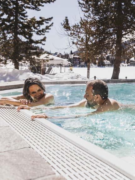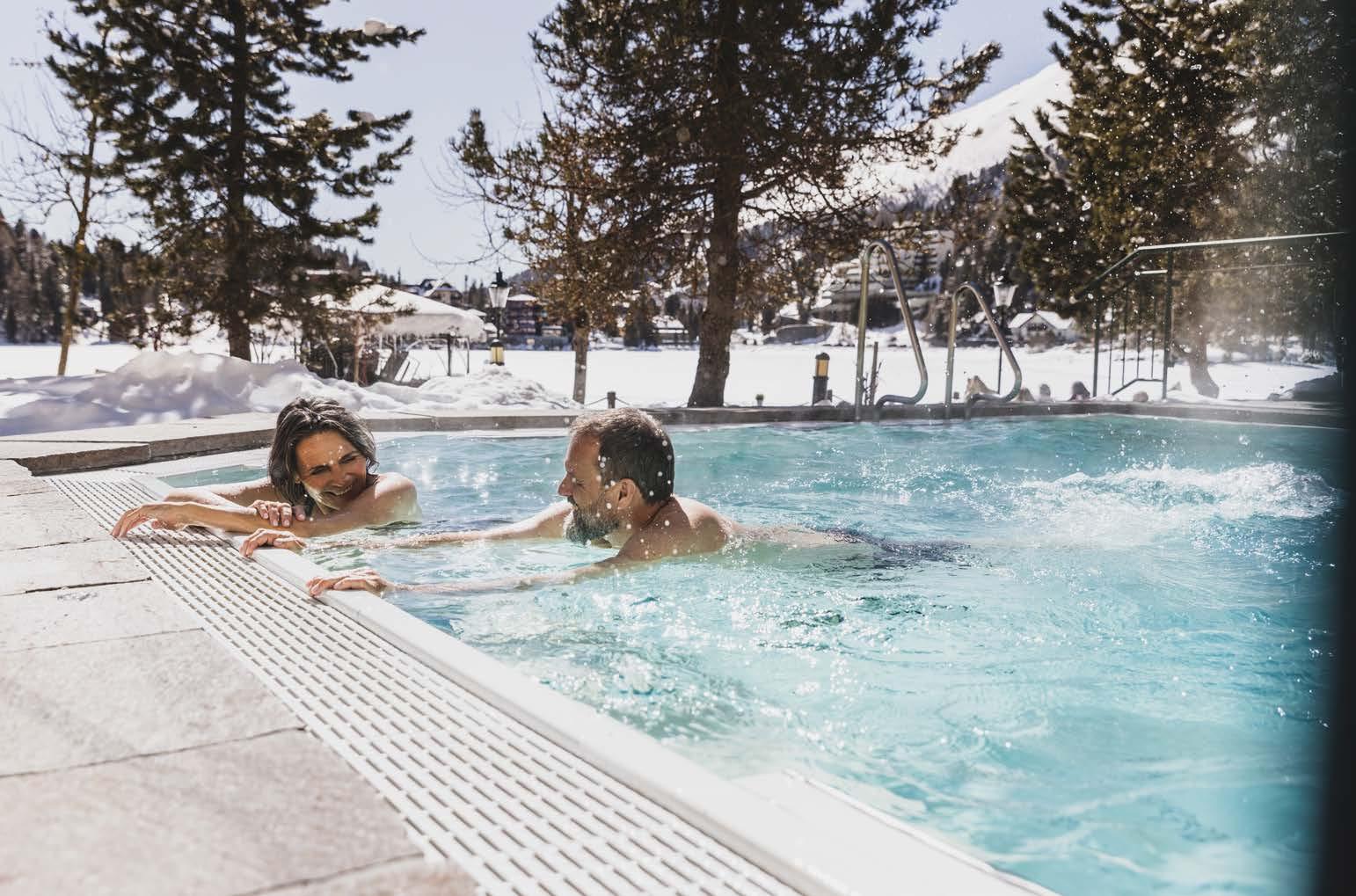 Entspannung im Pool – während ringsherum der Winter die Landschaft stillzeichnet.