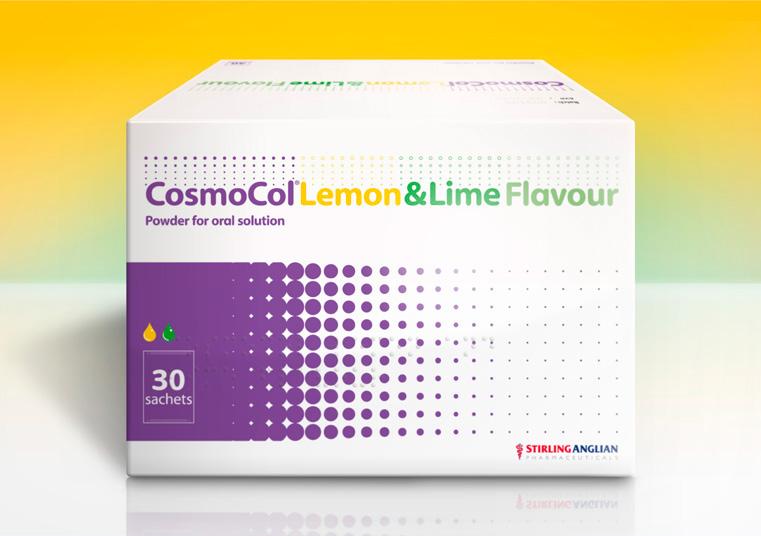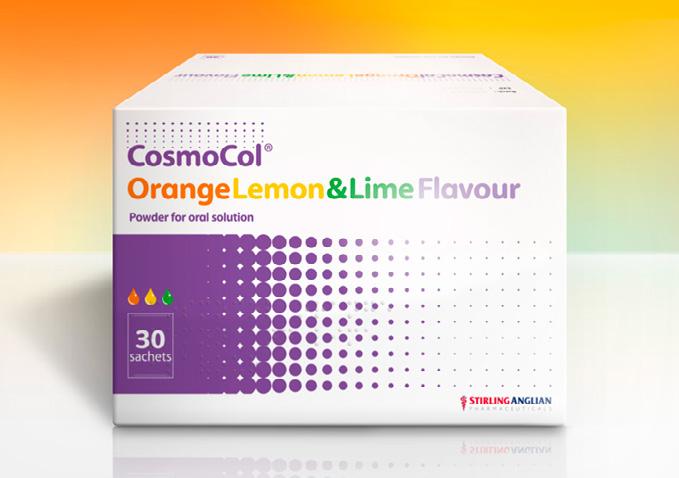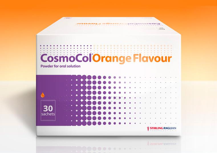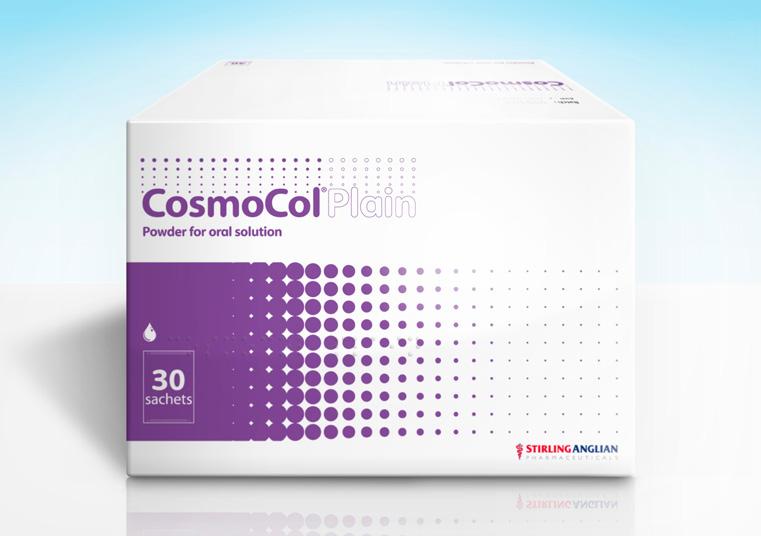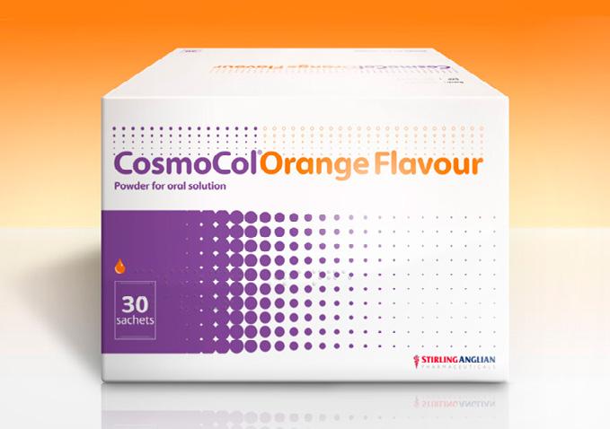 Please refer to the appropriate Summary of Product Characteristics (SmPC) before prescribing CosmoCol® powder for oral solution. CosmoCol Orange, Lemon and Lime Flavour, Orange Flavour, Lemon and Lime Flavour and CosmoCol Plain. Each sachet of powder contains 13.125 g macrogol 3350, 0.3507 g sodium chloride, 0.1785 g sodium hydrogen carbonate and 0.0466 g potassium chloride as active ingredients. CosmoCol Paediatric and CosmoCol Half 6.9 g powder. Each sachet of powder contains 6.563 g macrogol 3350, 0.1754 g sodium chloride, 0.0893 g sodium hydrogen carbonate and 0.0233 g potassium chloride as active ingredients. Products may contain orange, lemon and lime flavourings as labelled. Indications: The treatment of chronic constipation in adults, the elderly and children aged at least 2 years. The treatment of faecal impaction in patients aged 5 years or above. Dosage and administration: Chronic constipation: Adults and adolescents aged 12 years and above: CosmoCol: 1–3 sachets daily in divided doses, according to individual response. Each sachet should be dissolved in 125 ml of water. CosmoCol Half: 2–6 sachets daily according to individual response. Each sachet should be dissolved in 62.5 ml (quarter of a glass) of water. CosmoCol Paediatric for children aged 2 – 11 years: 1–4 sachets daily adjusted according to individual response. Each sachet should be dissolved in 62.5 ml (quarter of a glass) of water. Faecal impaction: Adults and adolescents aged 12 years and above: CosmoCol: 8 sachets daily all of which should be consumed within a 6 hour period. A course of treatment does not normally exceed 3 days. This dosage regime should be stopped as soon as the impaction is cleared. CosmoCol Half: 16 sachets daily. CosmoCol Paediatric for children aged 5–11 years: A course of treatment may take up to 7 days. Take the daily number of sachets in divided doses over a 12 hour period. In adults with impaired cardiovascular function and faecal impaction the dose should be divided so that no more than 4 sachets are taken in any one hour. The use of CosmoCol Paediatric to treat faecal impaction is not recommended in children with impaired cardiovascular or renal function. Contraindications: CosmoCol is contraindicated in intestinal obstruction or perforation caused by functional or structural disorder of the gut wall, ileus and in patients with severe inflammatory conditions of the intestinal tract (e.g. ulcerative colitis, Crohn’s disease and toxic megacolon). Hypersensitivity to the active substances or any of the excipients. Warnings and precautions: If patients develop any symptoms indicating shifts of fluids/electrolytes (e.g. oedema, shortness of breath, increasing fatigue, dehydration, cardiac failure) CosmoCol should be stopped immediately and electrolytes measured and any abnormality should be treated appropriately. When using high doses of this medicine to treat faecal impaction, use caution in patients with impaired gag reflex, reflux oesophagitis or reduced levels of consciousness. The lemon and lime flavour in CosmoCol Orange, Lemon and Lime Flavour sachets, Lemon and Lime Flavour sachets, Paediatric and Half products contains sorbitol (E420). Patients with rare hereditary problems of fructose intolerance should not take this medicine.
