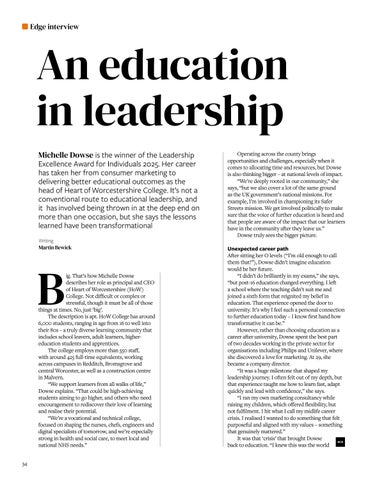An education in leadership Michelle Dowse is the winner of the Leadership Excellence Award for Individuals 2025. Her career has taken her from consumer marketing to delivering better educational outcomes as the head of Heart of Worcestershire College. It’s not a conventional route to educational leadership, and it has involved being thrown in at the deep end on more than one occasion, but she says the lessons learned have been transformational Writing Martin Bewick