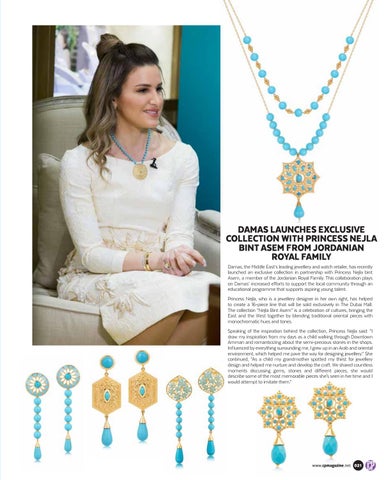 DAMAS LAUNCHES EXCLUSIVE COLLECTION WITH PRINCESS NEJLA BINT ASEM FROM JORDANIAN ROYAL FAMILY Damas, the Middle East’s leading jewellery and watch retailer, has recently launched an exclusive collection in partnership with Princess Nejla bint Asem, a member of the Jordanian Royal Family. This collaboration plays on Damas’ increased efforts to support the local community through an educational programme that supports aspiring young talent. Princess Nejla, who is a jewellery designer in her own right, has helped to create a 16-piece line that will be sold exclusively in The Dubai Mall. The collection “Nejla Bint Asem” is a celebration of cultures, bringing the East and the West together by blending traditional oriental pieces with monochromatic hues and tones. Speaking of the inspiration behind the collection, Princess Nejla said: “I draw my inspiration from my days as a child walking through Downtown Amman and romanticizing about the semi-precious stones in the shops. Influenced by everything surrounding me, I grew up in an Arab and oriental environment, which helped me pave the way for designing jewellery.” She continued, “As a child my grandmother spotted my thirst for jewellery design and helped me nurture and develop the craft. We shared countless moments discussing gems, stones and different pieces, she would describe some of the most memorable pieces she's seen in her time and I would attempt to imitate them.”