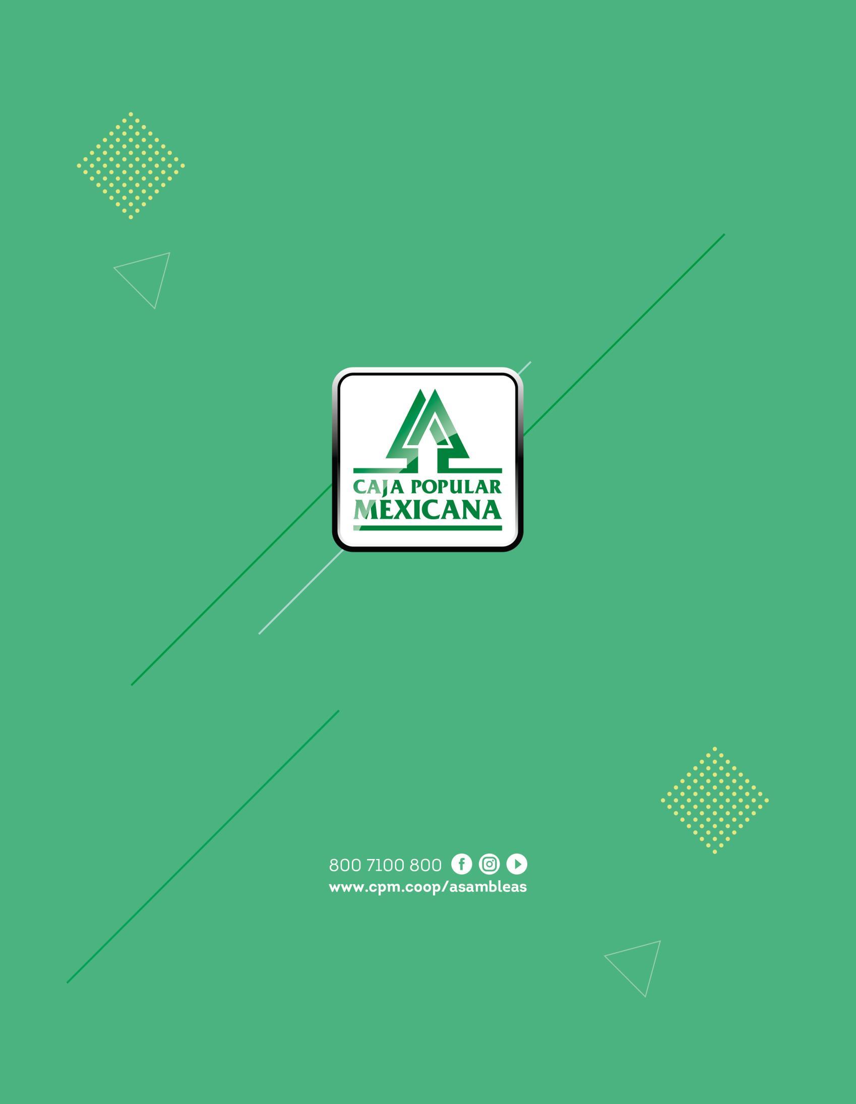 Caja Popular Mexicana les da la más cordial bienvenida a su asamblea de plaza. Mediante este proceso informativo y democrático, conocerán los resultados, beneficios, productos y apoyos que, como Sociedad Cooperativa, ponemos a su disposición como parte de nuestro objetivo para el logro del bienestar personal y familiar que permita mejorar la calidad de vida de cada uno de nuestros socios.