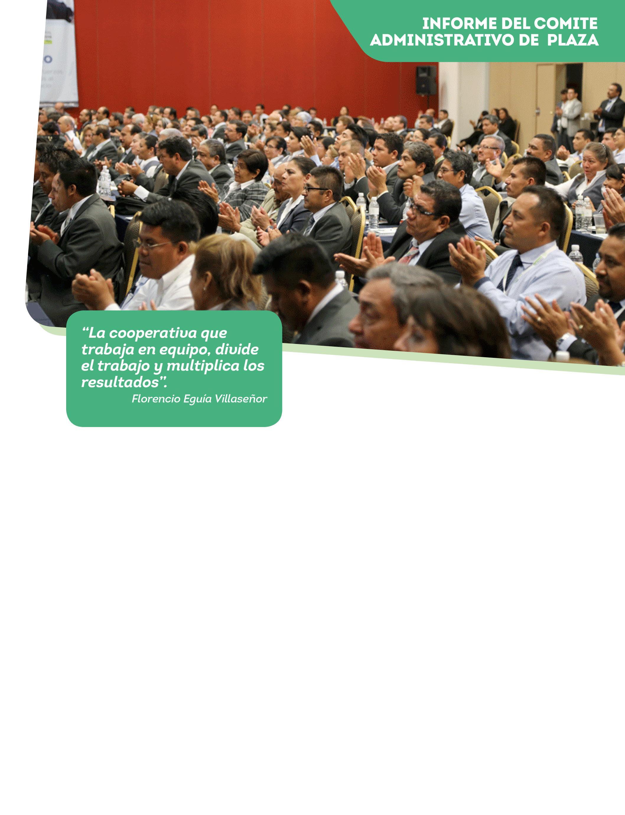 área operativa por continuar el gran trabajo y compromiso para mantener a Caja Popular Mexicana como la institución sólida y segura que por más de 70 años ha sido, siempre con el firme compromiso de seguir impulsando la economía de nuestros socios, ofreciéndoles a través de soluciones financieras una mejor calidad de vida; así mismo es ineludible reconocer lo importante que fue el apoyo de los socios, al continuar confiando y haciendo uso de los servicios de Caja Popular Mexicana, sin duda hacen la pauta para que esta noble institución continúe creciendo con solidez y fiabilidad, por eso nuestro más sincero agradecimiento; destacamos también la aportación de los Comités Promotores de cada sucursal, los cuales con su participación y notorio desempeño en sus funciones fueron parte fundamental para que nuestra sociedad cooperativa; continúen ofreciendo servicios y productos financieros a los socios, además de lograr el crecimiento de su membresía; nuevamente demostramos que uniendo esfuerzos y trabajando por el mismo objetivo, nuestra Plaza seguirá creciendo y alcanzado los resultados financieros que se han proyectado.