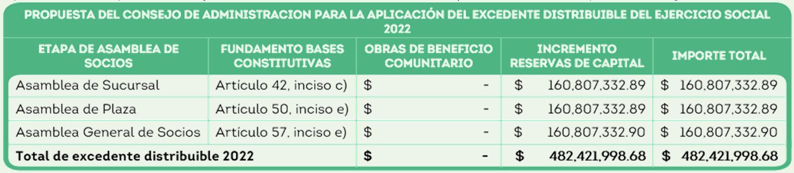 Si las Asambleas de Sucursal, Plaza y General de Socios acuerdan aplicar el excedente distribuible en los términos de la propuesta emitida por el Consejo de Administración, la distribución quedará como se expone en la siguiente tabla: