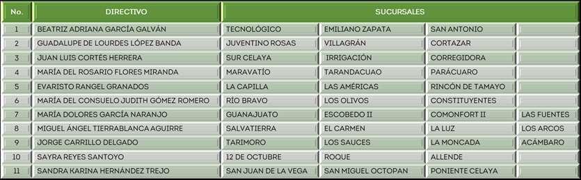 XX 1801 Guanajuato 3 1802 Rincón de Tamayo 3 1803 Río Bravo 2 1804 Tarimoro 2 1805 Villagrán 3 1806 San Miguel Octopan 2 1807 Sur Celaya 2 1808 Poniente Celaya 2 1809 San Juan de la Vega 3 1810 Salvatierra 2 1811 Moncada 2 1812 Cortazar 3 1813 Juventino Rosas 3 1814 Acámbaro 2 1815 Tecnológico 2 1816 Irrigación 1 1818 Las Américas 2 1819 Comonfort II 3 1820 Maravatío 2 1821 El Carmen 3 1822 Parácuaro 1 1823 Escobedo II 2 1824 Roque 1 1825 Las Fuentes 2 1826 San Antonio 2 1827 Tarandacuao 2 1828 Corregidora 3 1829 Los Sauces 2 1830 Constituyentes 3 1831 Allende 3 1832 Los Arcos 2 1833 Emiliano Zapata 2 1834 12 de Octubre 3 1835 La Luz 2 1836 La Capilla 2 1837 Los Olivos 2 1800 Plaza Celaya 81 04