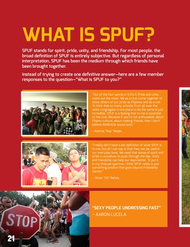 WHAT IS SPUF? SPUF stands for spirit, pride, unity, and friendship. For most people, the broad definition of SPUF is entirely subjective. But regardless of personal interpretation, SPUF has been the medium through which friends have been brought together. Instead of trying to create one definitive answer—here are a few member responses to the question—“What is SPUF to you?” “Out of the four words in S.P.U.F, Pride and Unity stand out the most. We as a club come together to show others of our pride as Filipinos and as a unit. To think that so many schools from all over the state congregate in one place to do the same is just incredible. SPUF is a feeling that to me is essential to the club. Because if you’re not enthusiastic about Filipino culture, about making friends, then I don’t believe BARKADA would exist.” – Karima “Kay” Reyes