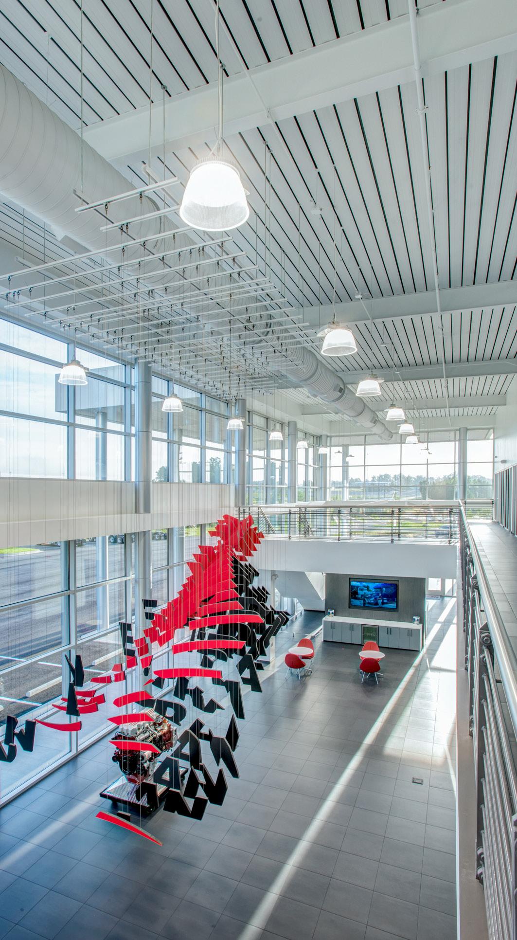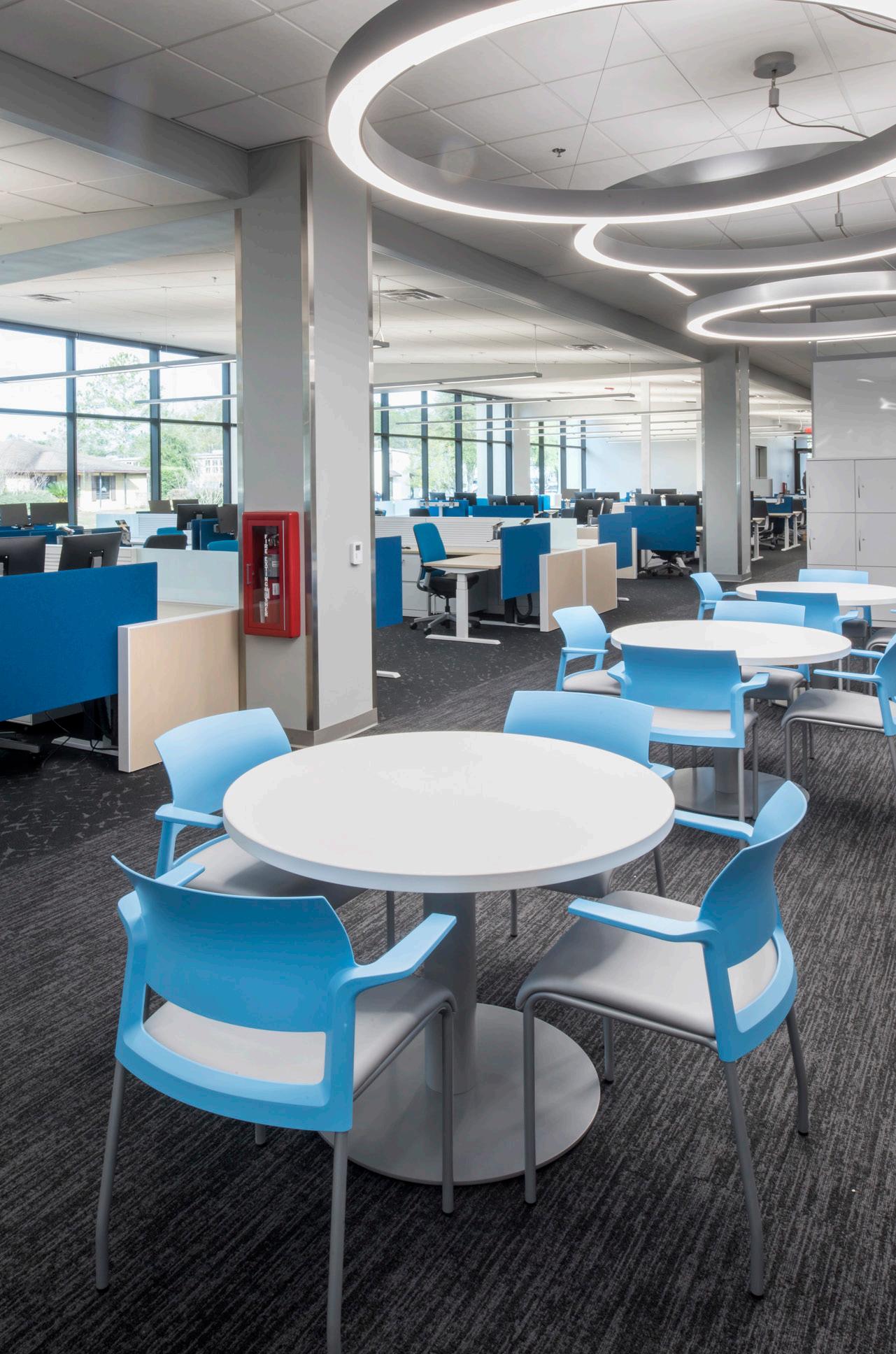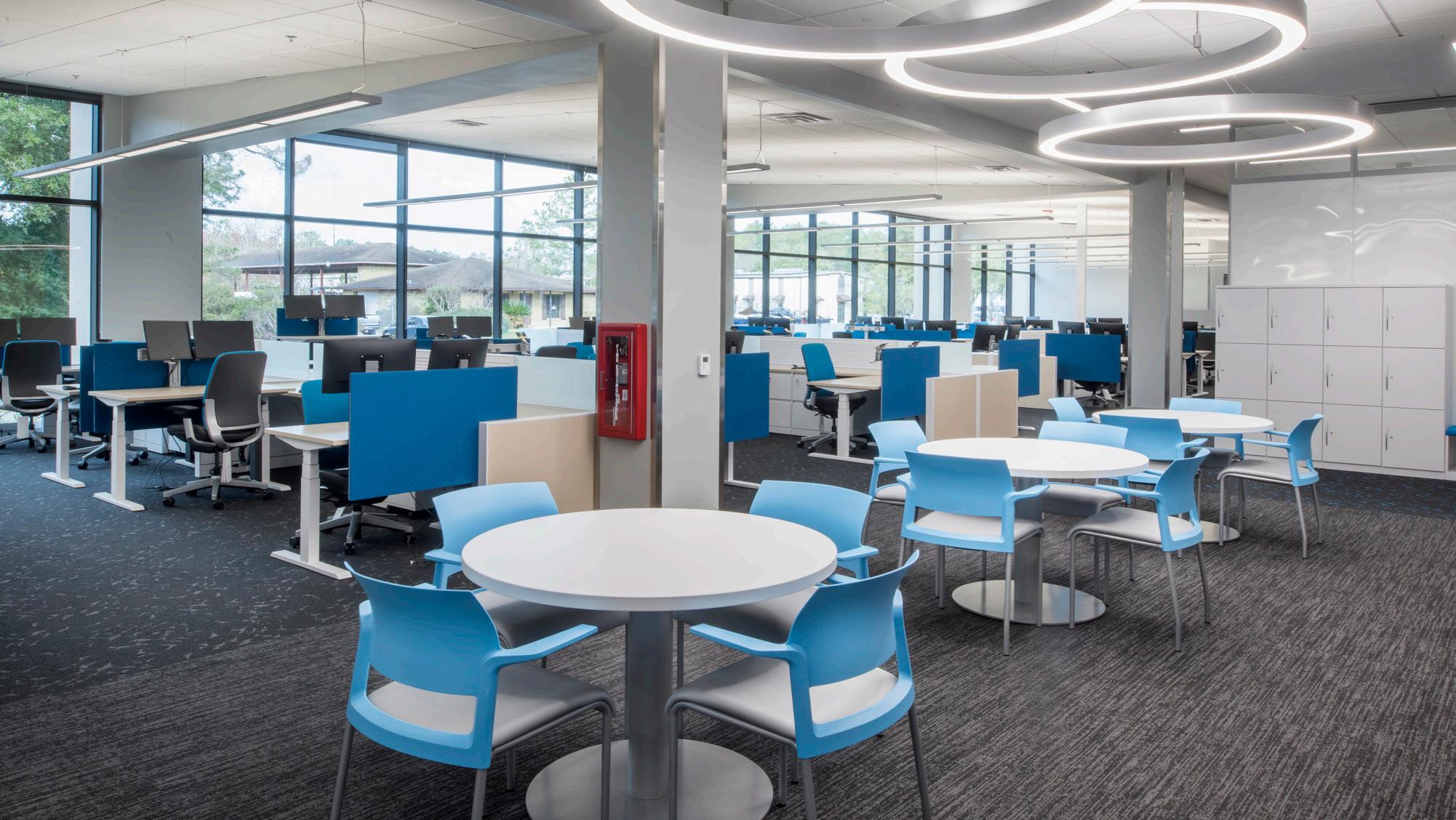 This project consisted of a multi-phased campus expansion that included a 66,756 manufacturing and office space addition, a complete interior renovation of the existing Exactech facility, and a new 592-space parking garage. The expansion consists of two stories of office and mixed-used space, as well as 15,500 SF of manufacturing space on the ground floor. The interior design centers around the hightech manufacturing space, a two-story space with a glass wall perimeter separating the space from meeting rooms, break areas, and circulation areas that are all able to view down into the space from the second level. The design intent is to use this as a show piece when visiting surgeons visit the facility to learn about Exactech’s advancements in their field and to witness the production of the product being manufactured. The remainder of the facility is a two-story open floor plan design which houses office and multi-use space to allow Exactech to expand and reconfigure as they grow.