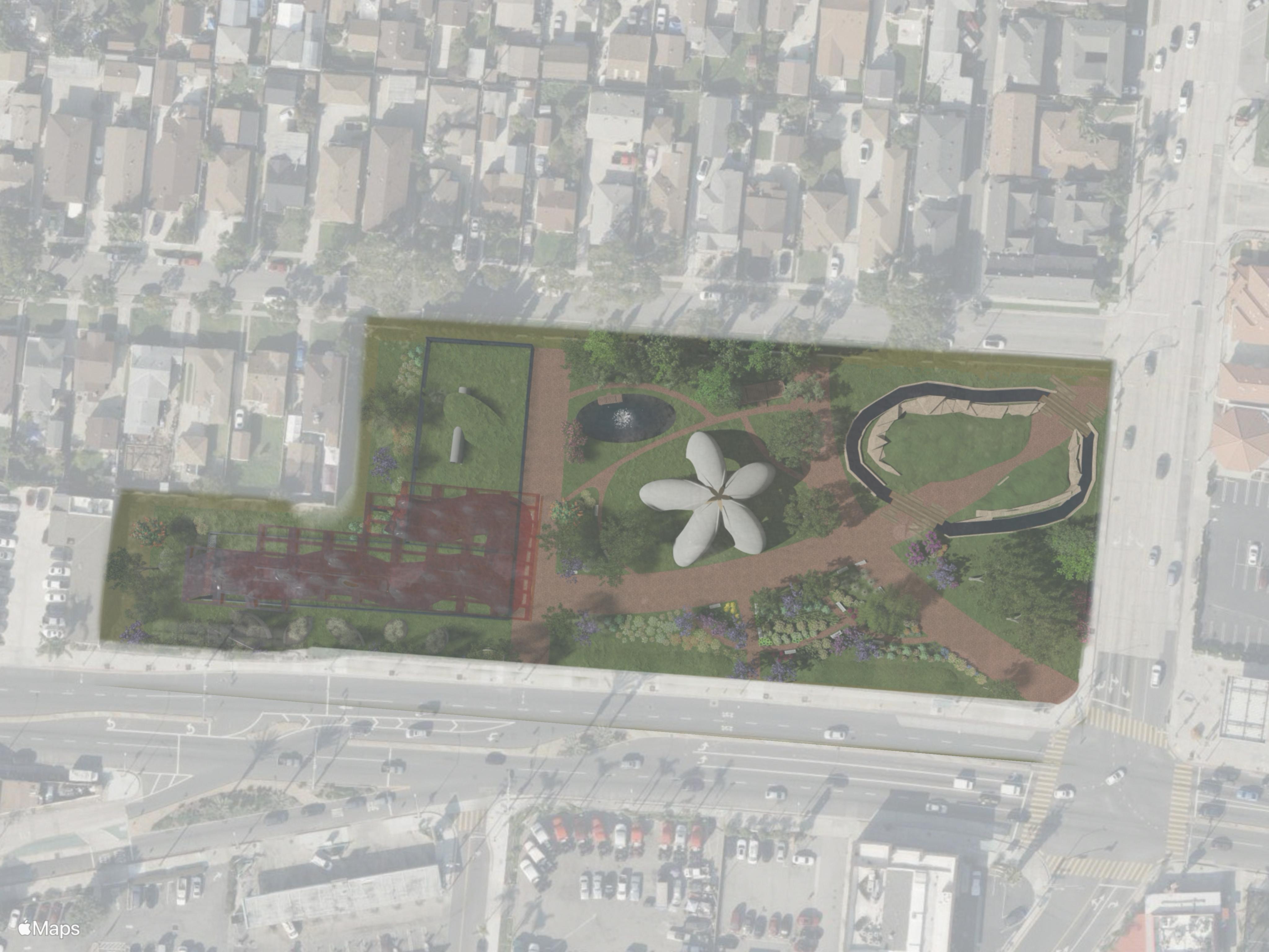 This team project was set out to transform an empty lot at Tweedy Boulevard and Atlantic Avenue into a vibrant, multifunctional community space that reflects the cultural and ecological essence of South Gate. Through a collaborative design process, we identified four key priorities: public space, water infrastructure, resilient landscapes, and habitat.