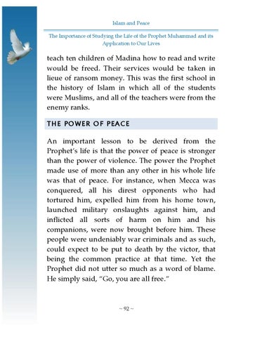 teach ten children of Madina how to read and write would be freed. Their services would be taken in lieue of ransom money. This was the first school in the history of Islam in which all of the students were Muslims, and all of the teachers were from the enemy ranks. THE POWER OF PEACE