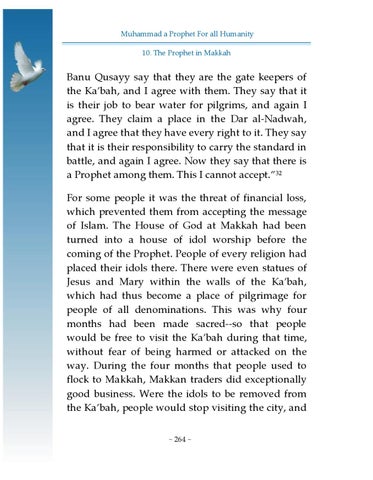 Banu Qusayy say that they are the gate keepers of the Ka’bah, and I agree with them. They say that it is their job to bear water for pilgrims, and again I agree. They claim a place in the Dar al-Nadwah, and I agree that they have every right to it. They say that it is their responsibility to carry the standard in battle, and again I agree. Now they say that there is a Prophet among them. This I cannot accept.”32 For some people it was the threat of financial loss, which prevented them from accepting the message of Islam. The House of God at Makkah had been turned into a house of idol worship before the coming of the Prophet. People of every religion had placed their idols there. There were even statues of Jesus and Mary within the walls of the Ka’bah, which had thus become a place of pilgrimage for people of all denominations. This was why four months had been made sacred--so that people would be free to visit the Ka’bah during that time, without fear of being harmed or attacked on the way. During the four months that people used to flock to Makkah, Makkan traders did exceptionally good business. Were the idols to be removed from the Ka’bah, people would stop visiting the city, and ~ 264 ~