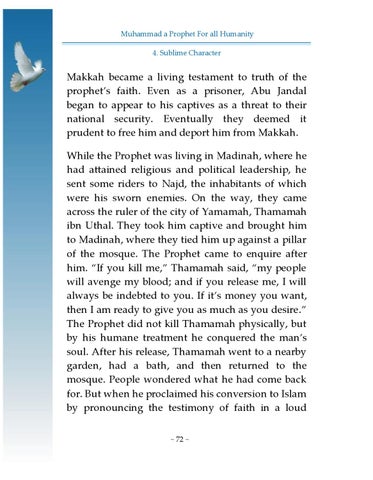 Makkah became a living testament to truth of the prophet’s faith. Even as a prisoner, Abu Jandal began to appear to his captives as a threat to their national security. Eventually they deemed it prudent to free him and deport him from Makkah. While the Prophet was living in Madinah, where he had attained religious and political leadership, he sent some riders to Najd, the inhabitants of which were his sworn enemies. On the way, they came across the ruler of the city of Yamamah, Thamamah ibn Uthal. They took him captive and brought him to Madinah, where they tied him up against a pillar of the mosque. The Prophet came to enquire after him. “If you kill me,” Thamamah said, “my people will avenge my blood; and if you release me, I will always be indebted to you. If it’s money you want, then I am ready to give you as much as you desire.” The Prophet did not kill Thamamah physically, but by his humane treatment he conquered the man’s soul. After his release, Thamamah went to a nearby garden, had a bath, and then returned to the mosque. People wondered what he had come back for. But when he proclaimed his conversion to Islam by pronouncing the testimony of faith in a loud ~ 72 ~