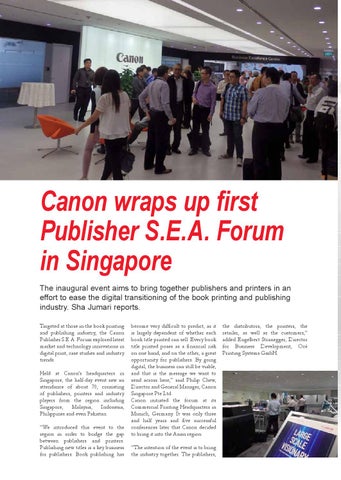 Canon wraps up first Publisher S.E.A. Forum in Singapore The inaugural event aims to bring together publishers and printers in an effort to ease the digital transitioning of the book printing and publishing industry. Sha Jumari reports. Targeted at those in the book printing and publishing industry, the Canon Publisher S.E.A. Forum explored latest market and technology innovations in digital print, case studies and industry trends. Held at Canon’s headquarters in Singapore, the half-day event saw an attendance of about 70, consisting of publishers, printers and industry players from the region including Singapore, Malaysia, Indonesia, Philippines and even Pakistan. “We introduced this event to the region in order to bridge the gap between publishers and printers. Publishing new titles is a key business for publishers. Book publishing has