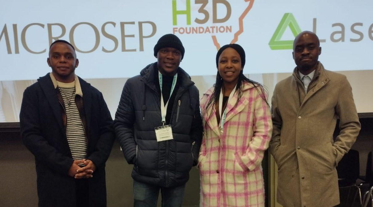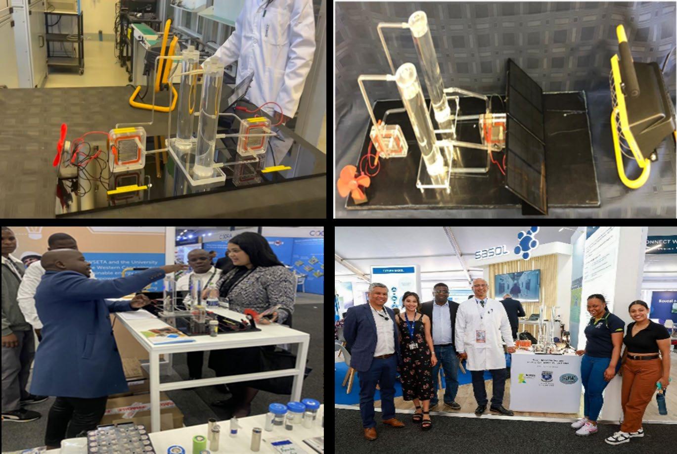 Upper Top: Green Hydrogen Educational Kit demonstration, Bottom Left: Anele Sinto (2023 WIL graduate) demonstrating the Green Hydrogen Kit at Enlit Conference, Bottom Right: from the right to left: Dr Bradley Cerff (SAIAMC), Stanford Chidziva (SAIAMC), Mr Masters, Gerry (Sasol), Dr Dorcas Zide (CPUT) and two students.