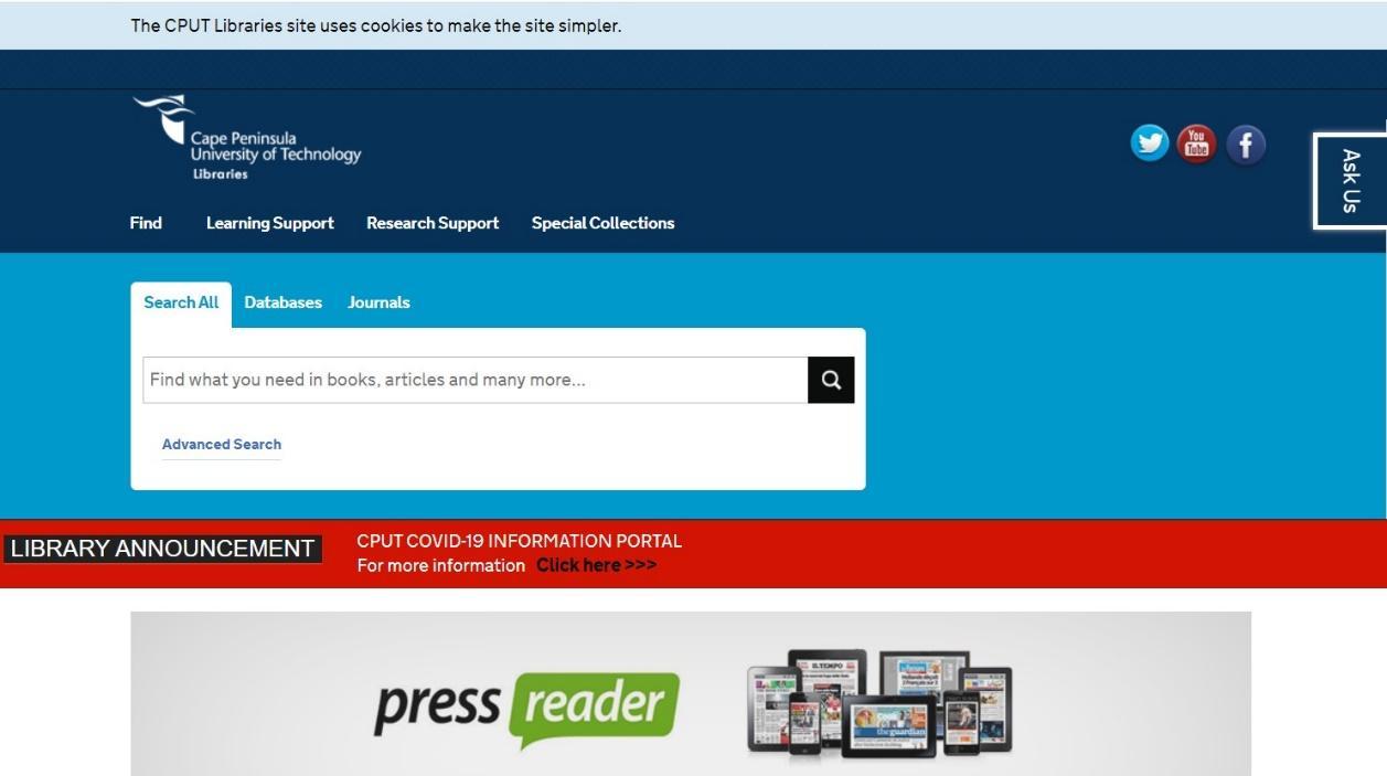 The library is an essential resource for students and staff. Whether on campus or off campus, there are various ways of getting assistance from staff within the library. There is a virtual support option on the CPUT library website at https://www.cput.ac.za/lib and on the right-hand side of your screen, you will see a blue button called “Ask Us”.
