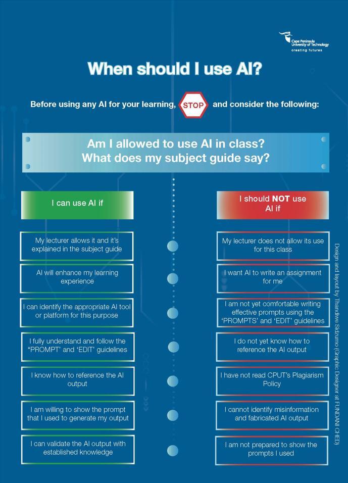 The Faculty and Institution wishes to support students to use AI in the most effective way, so that it enables your learning in an ethical and responsible way. There are countless ways that AI can help you on your learning journey at CPUT and beyond. But first, we need to ensure that we are aware of the various platforms that are available, and that we use AI in very responsible ways.