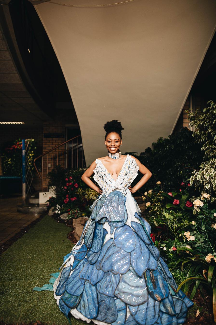 When I was creating my garments I was thinking Royalty, Queens, Princesses because I believe that in every woman there's a queen. The colors in the dresses are an inspiration from butterflies called pipevine swallowtail, the blue and black butterfly is well known for representing wisdom, imagination, freedom, intuition, harmony, inspiration as well as depth, trust, confidence, peace, and calmness. Models: Anesipho Dyosi & Okuhle Lingani