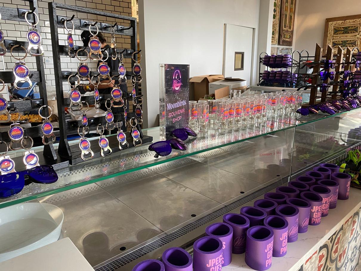 The space was open from 128pm which was nice. When youenteredinsidethevenue, there was a Moonbirds “souvenir shop” with neoncolored, Miami branded swag like shot glasses, keychains, sunnies and patches. Further down, there were light blue denimjacketswithMoonbirds logo embroidered on the back; and, if that wasn’t enoughforsomefolks,there