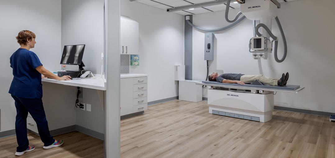 Provider pods are tied together by a centralized X-Ray and MRI suite, located to both minimize footsteps and ease patient wayfinding inside the clinic. Two procedure rooms and a physical therapy tenant provide complementary clinic services.