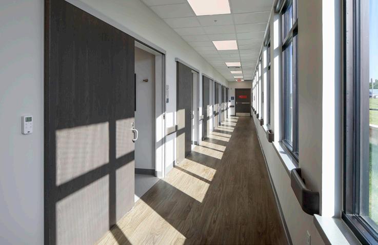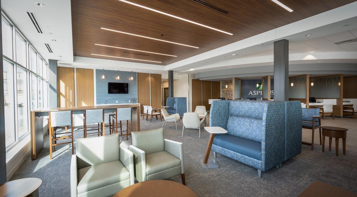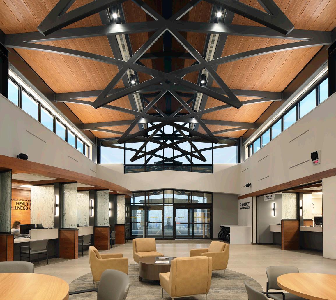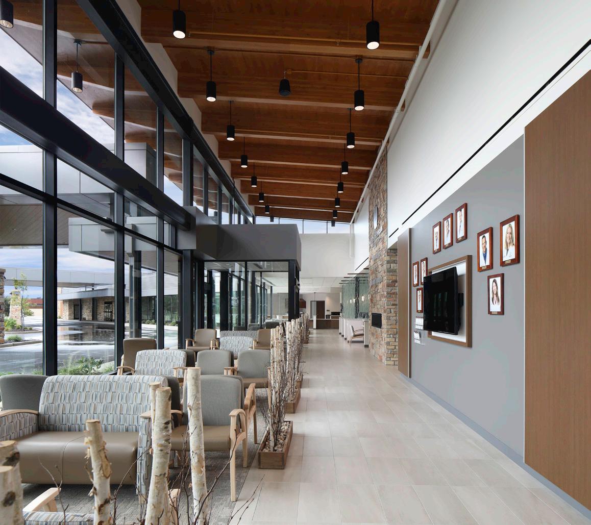 Interior design inspiration came from the surrounding Wausau region, with a focus on locally sourced and natural materials. Rich wood tones are balanced with neutrals and blues, creating a welcoming and inviting atmosphere for patients and staff alike. Interior spaces are generously daylit.