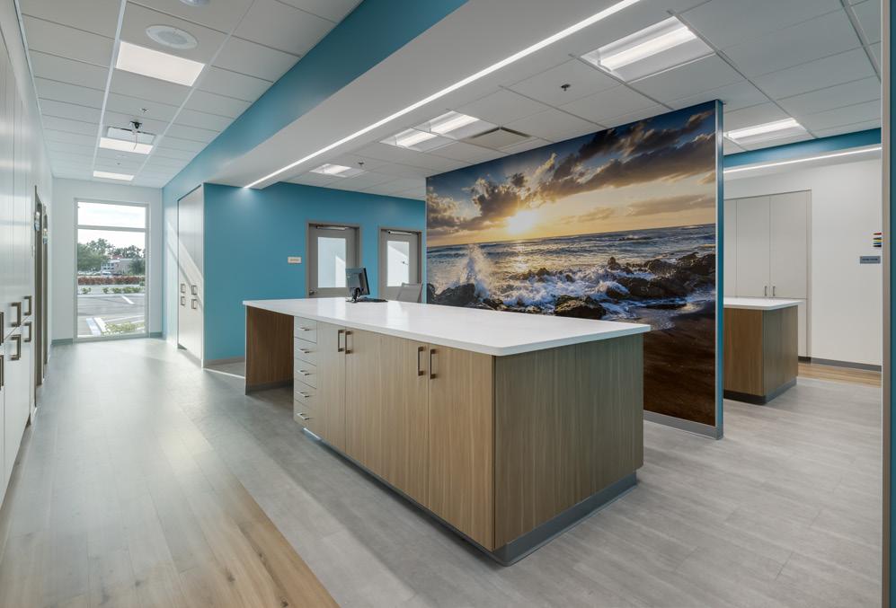 The clinic is laid out in easily identifiable pod clusters, each with 3 exam rooms arranged around a central staff workstation. This collaborative working model allows the care team to easily interact with their patients. Each pod features a centralized digital wall covering showcasing a color theme and local nature images, making wayfinding easier for patients. Accent colors are bright and vibrant, offset by an otherwise neutral palette and abundant natural daylight.