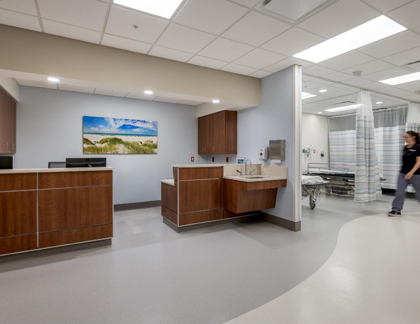 The program includes a newly renovated Cath Lab, a single OR suite with its own sterile processing area, staff locker/changing area, clean and soiled holding, and Clinical Manager Office. The new ASC includes a five-bay Pre-Op suite with a nurse station and support space. The Pre-Op Suite was designed to be flexible, serving as extra Post-Op Bays when patient volumes change. Four existing PostOp rooms were modified to comply with the current AHCA requirements. Two new Post-Op rooms were added within the building expansion for a total of six private recovery rooms to support the OR and Cath Lab. The newly renovated Control Room supports both the existing Cath Lab and the new Operating Room, increasing physician and staff efficiency.