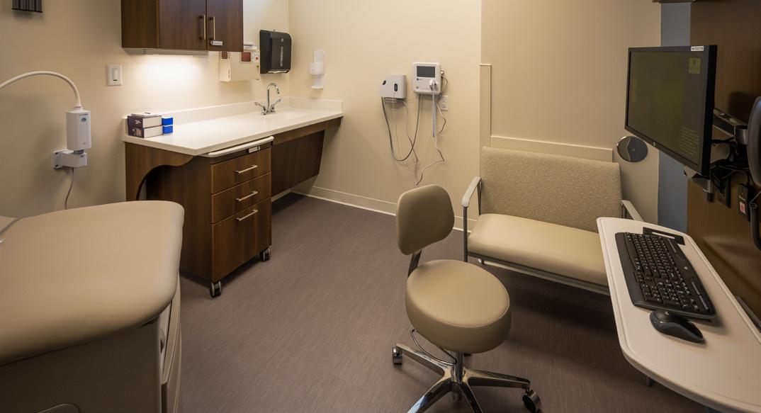 In each clinical area, universally-sized patient care rooms are designed to bring all care team services to the patient. Patients are escorted into each dual entry exam room via a patient corridor, with the care team entering in from a centralized collaborative staff teamwork area.