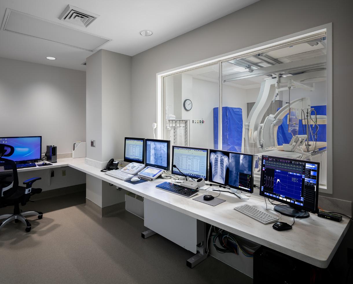 PRA was selected by Florida Heart Associates to renovate the existing Cardiac Catheterization Lab and support spaces to improve the suite’s overall efficiency and state-of-the-art performance. Technology was upgraded throughout the lab and neighboring support spaces to meet AHCA requirements for future expansion of the suite. Renovations of the existing Control Room were planned to seamlessly accommodate support of a future Operating Room anticipated in the upcoming Ambulatory Surgery Center addition.