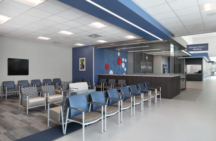 Patients are welcomed into a two-story light-filled lobby and register at the main reception desk. Each primary and specialty care waiting area on first floor is accentuated by flooring pattern and matching colored soffits to aid in patient wayfinding. An open monumental stair brings additional primary care patients to the second floor.