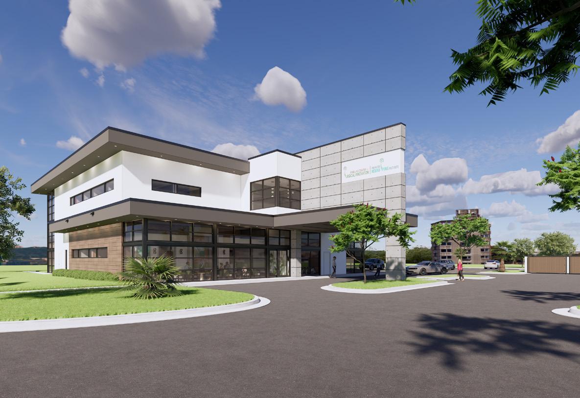 The exterior design harmonizes with the City’s Venetian architectural guidelines, featuring expansive glass façades that promote natural light and wellness throughout. A prominent entrance canopy invites patients into a spacious waiting area, characterized by warm wood tones and a living green wall, creating a welcoming atmosphere. The interior finishes are thoughtfully curated to seamlessly incorporate the doctors’ brand into the architecture.