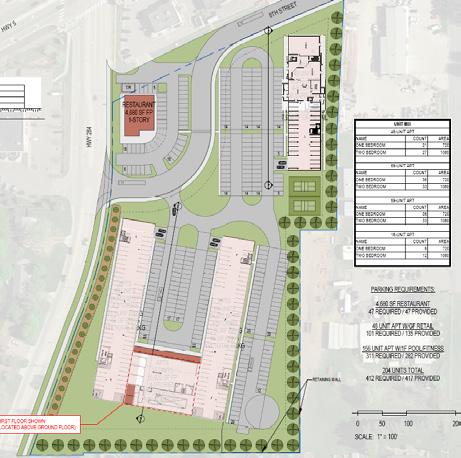 9.25 Acre Multi-Use Master Planning. Facilitated Zoning approval with the City with Owner’s Proforma. 4,680SF Traditional Built Restaurant, Modular Four Story 48 Unit with Ground Level Retail and Modular 156 Unit Two-Phase Four Story with Precast / Site-Cast Parking Podium.