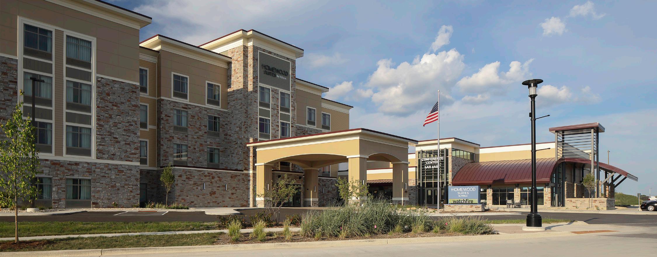 Near Milwaukee, a four-story hotel and conference center offers 121 upscale suites connected to a modern conference center. Amenities include dining, meeting rooms, fitness center, and spacious units with living room and kitchenette.